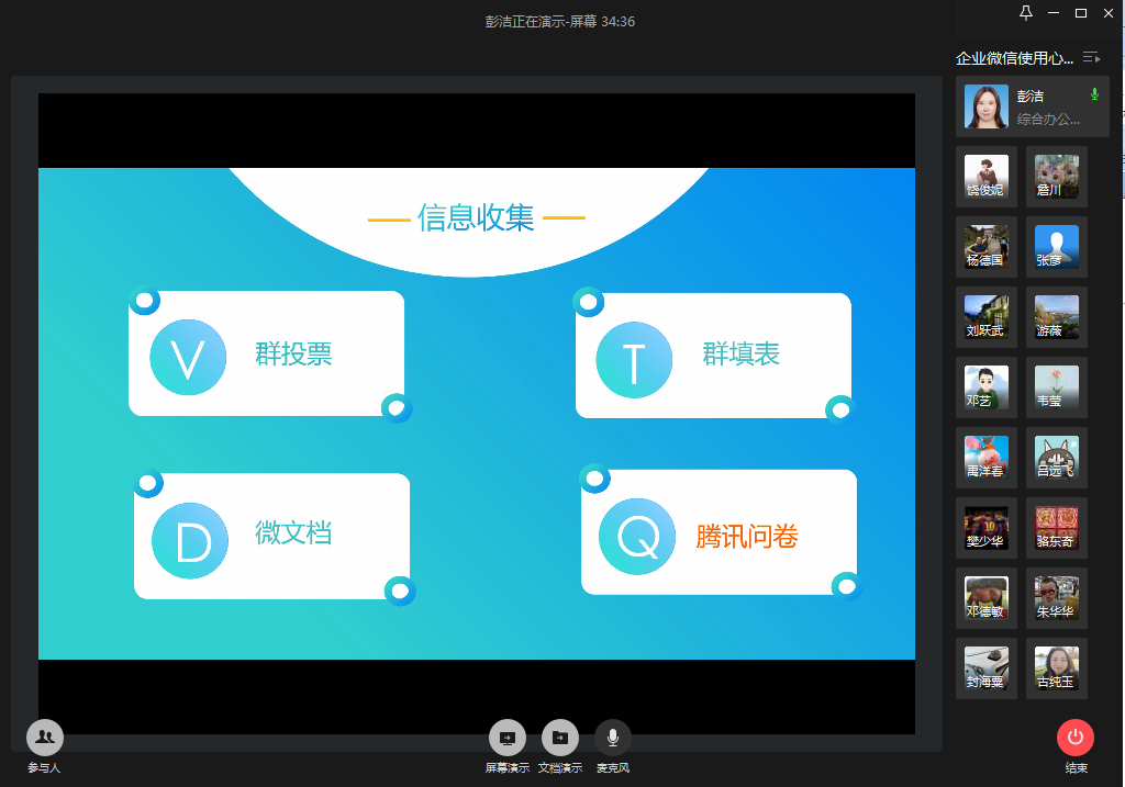 参加本次交流会的领导和老师,也将自己在使用企业微信中遇到的问题提出来进行讨论,对彭洁老师介绍的“公告发布”、“腾讯问卷”等应用可能使用方式进行了交流。