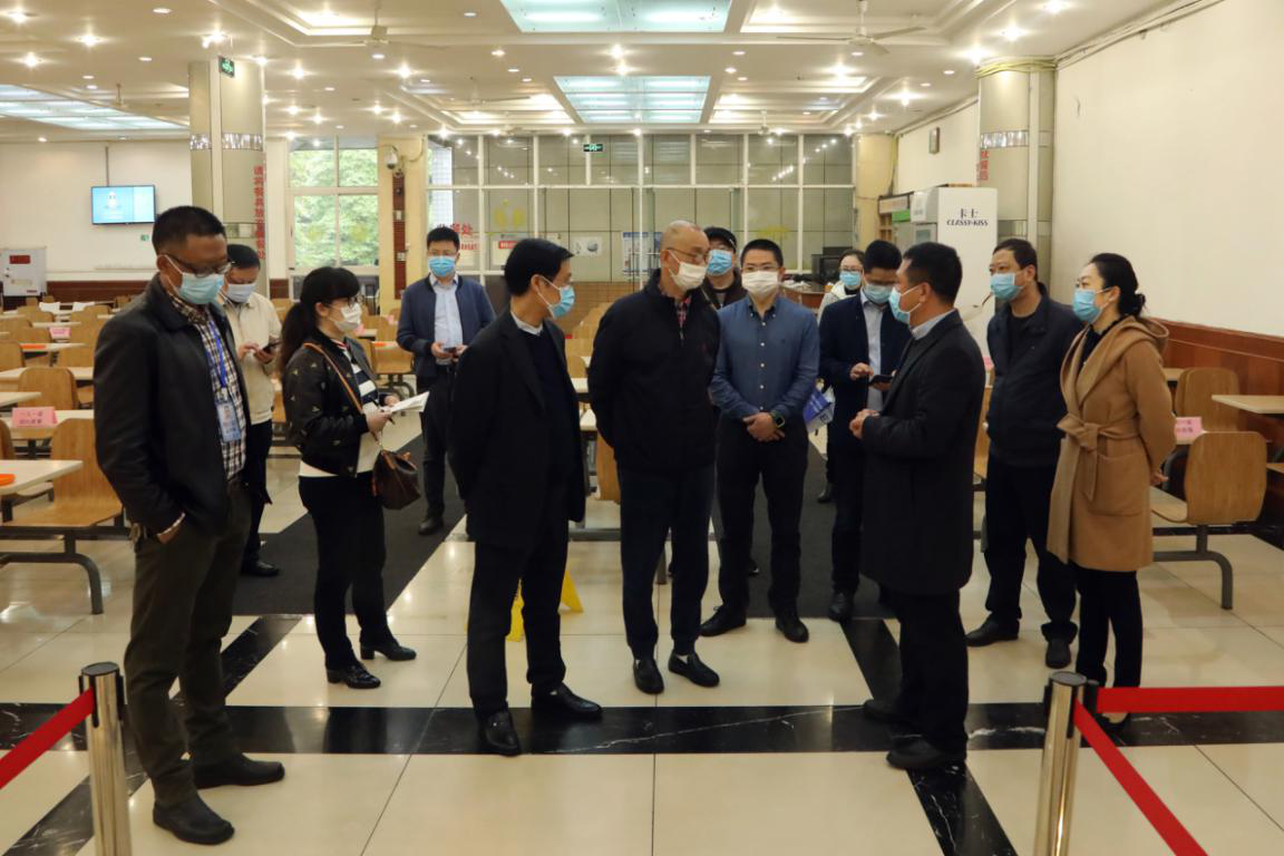 朱维主任一行首先到学校门岗室、教工食堂等地实地查看,并询问了学生入学报道、学生宿舍、物资储备、应急隔离措施等开学准备情况。