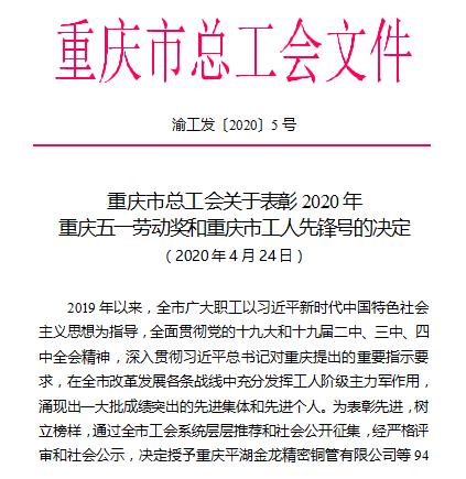 近日,重庆市总工会发布了《关于表彰2020年重庆五一劳动奖和重庆市工人先锋号的决定》,表彰一批为全市经济建设和社会发展及抗击“新冠”肺炎疫情工作中做出突出贡献的先进集体和先进职工。pp电子荣获“重庆五一劳动奖状”。