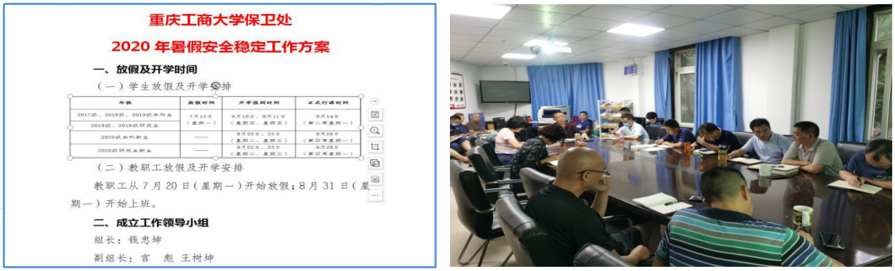为圆满完成暑期校园封闭式管理和安全稳定工作,根据7月16日学校第五次中层干部会议精神和《关于2020年暑假放假及开学安排的通知》安排,按照分管校领导的要求,保卫处高度重视,提前制定了《pp电子游戏平台网站保卫处2020年暑假安全稳定工作方案》,细化了《pp电子游戏平台网站保卫处2020年暑期值班安排表》,并于7月17日上午召开全处干部大会,对暑期校园疫情防控和安稳工作进行了周密部署。