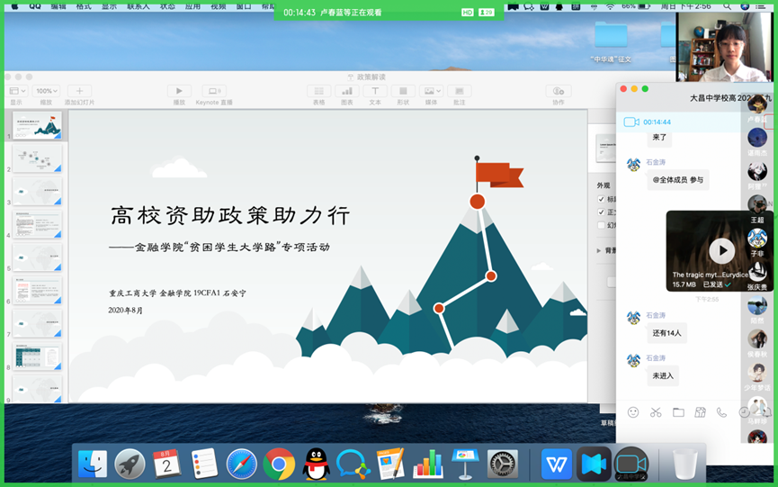为更好的宣传和宣讲国家脱贫攻坚、助学政策,8月5日下午、6日上午,pp电子金融学院“金夏归故,融惠兴乡”脱贫攻坚服务团队员石安宁、贺超分别线上连线大昌中学学生,线下邀请双江中学部分贫困毕业生,开展“高校资助政策助力行”宣讲活动,进行贫困大学生帮扶政策的解读。