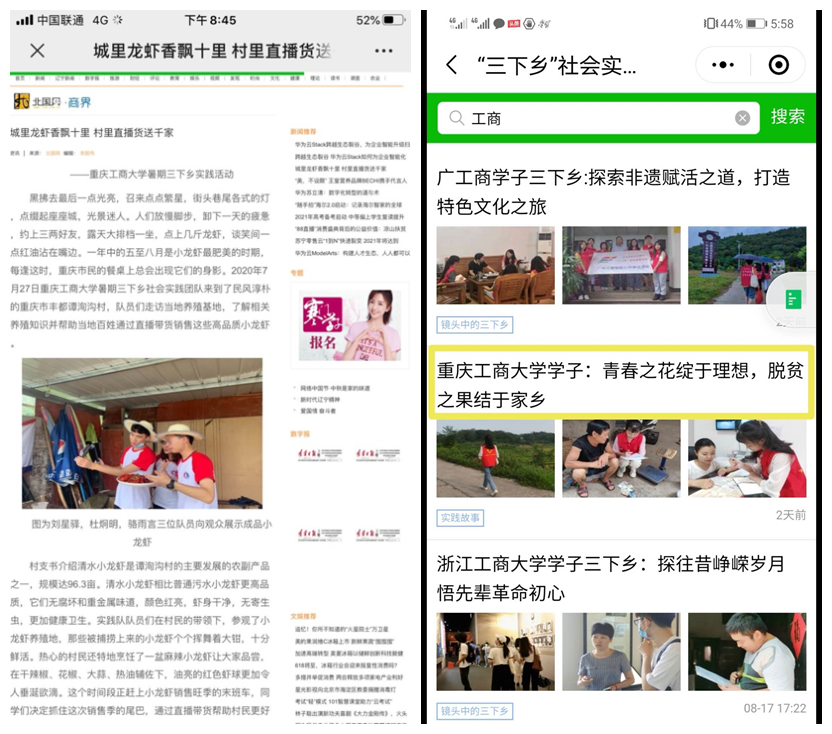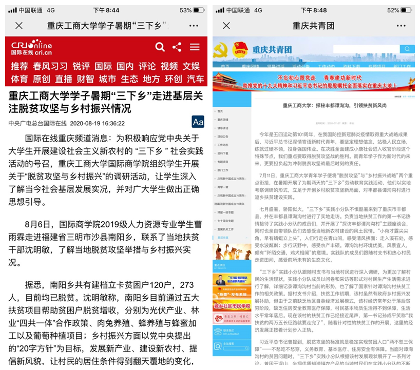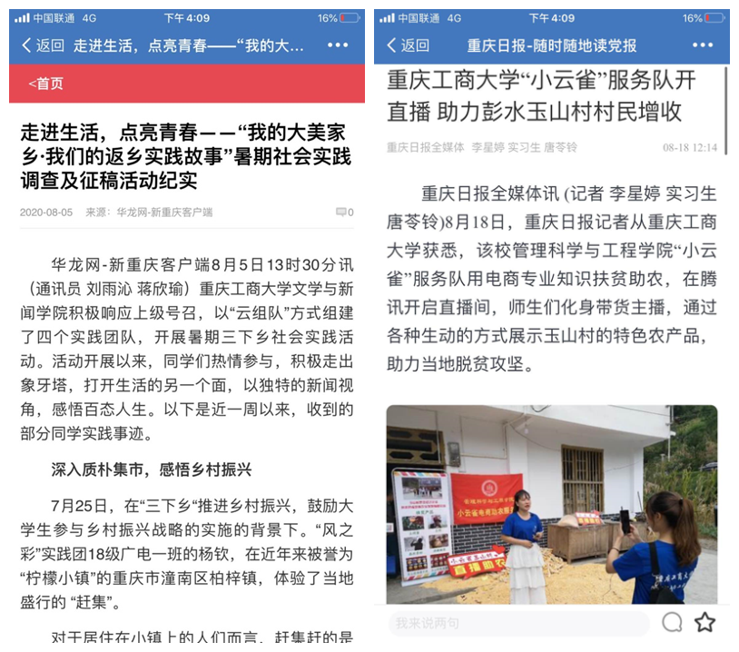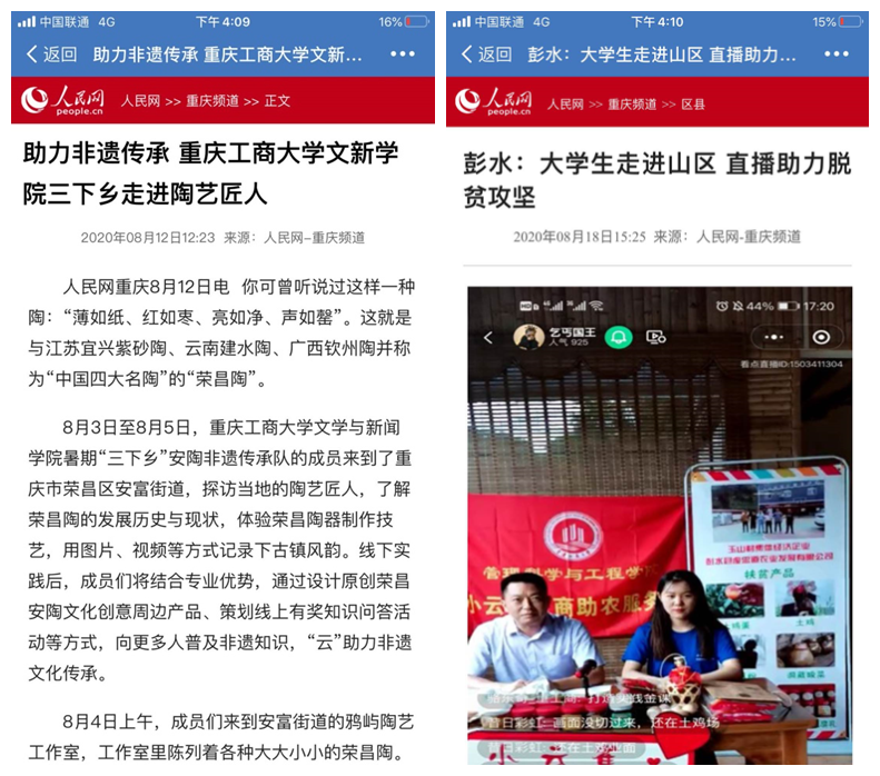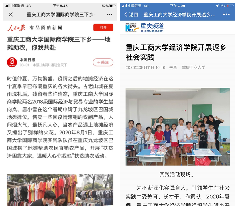 pp电子本次暑期社会实践覆盖全校19个学院,各学院实践队伍开设多种实践课程,形成多篇高质量调研报告和优秀文化作品,如《pp电子游戏平台网站学子:青春之花绽于理想,脱贫之果结于家乡》、《没有生而英勇,只有选择无畏——国际商学院三下乡活动抗疫温暖》、《管理科学与工程学院:大学生走进山区,直播助力脱贫攻坚》等优秀三下乡社会实践调研作品,扎实推动习近平新时代中国特色社会主义思想在基层普及,广泛宣传了国家方针政策,充分践行了“不忘初心,牢记使命”的教育,发扬了“不怕吃苦,躬身实践”的志愿精神,为乡村振兴贡献了青春力量,不仅获得了当地政府、社会的认可,同时也被《人民日报》、《新华网》、《人民网》、《中国青年网》、《共青团中央服务青年发展部微信平台》、《中央广电总台国际在线》、《重庆共青团》官方网站、《重庆市教委官方微信平台》、《华龙网》、《重庆日报》、《彭水手机台》等多家媒体报道。