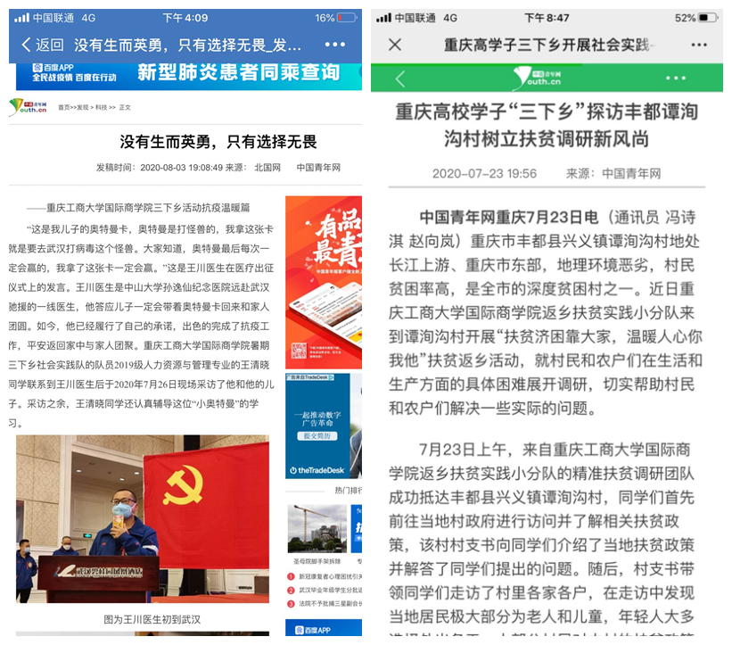 据悉,在新冠肺炎疫情防控期间,pp电子通过多举措、多模式、多渠道开展了“三下乡”实践活动,同时通过多平台、多角度,展示青年学生实践风采。搭建“青春工商大公众号”“团委微博”“团委网站”三维宣传平台,开设“小我融入大我 青春献给祖国”主题三下乡、“返家乡实践故事”和各学院特色创新活动展播三个专栏,积极宣传报道pp电子学子在学思践悟中坚定理想信念,在奋发有为中践行初心使命,充分发挥了育人实效。此次“三下乡”活动,不仅锻炼了大学生的社会服务能力,增长了他们的知识和才干,也通过社会媒体的广泛关注与报道,展现了重工商大学子用脚步丈量梦想,用青春在实践中绽放的责任感与使命感。
