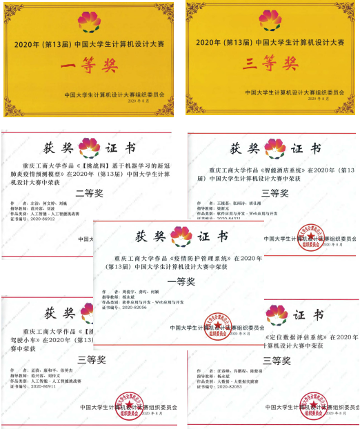 本届大赛吸引了来自全国近700所院校、约3万件作品参赛,其中半数以上双一流高校参加了该赛事。来自pp电子人工智能学院的参赛作品《疫情防护管理系统 》(作者:周俊宇、龚玙、何颖,指导老师:杨永斌)获得全国一等奖、《【挑战四】基于机器学习的新冠肺炎疫情预测模型》(作者:左洁、何文婷、刘巍,指导老师:范兴容、刘波)获得全国二等奖、《定位数据评估系统》(作者:汪春峰、许鹏程、陈修羽,指导老师:杨永斌)获得全国三等奖、《智能酒店系统》(作者:王镜荔、张雨诗、胡仕湘,指导老师:梁新元)获得全国三等奖、《【挑战一】基于深度学习的自动驾驶小车》(作者:孟滇、康和平、徐英杰,指导教师:范兴容、刘传文)获得全国三等奖。