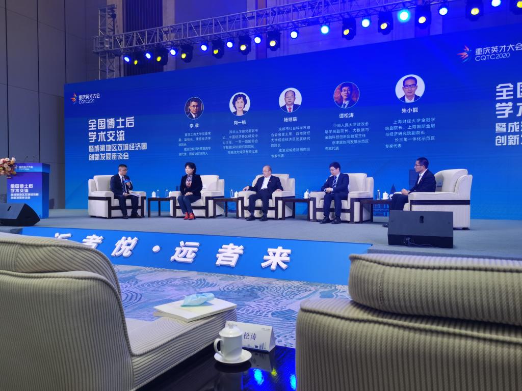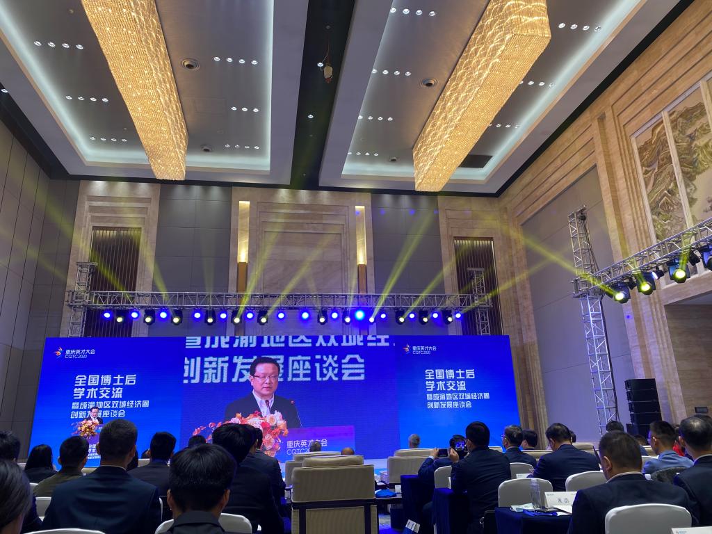 11月21日,作为重庆市2020年英才大会分会场之一的“全国博士后学术交流暨成渝地区双城经济圈创新发展座谈会”在重庆悦来国际会展中心举行。本次会议由全国博士后管委会办公室、重庆市人力资源和社会保障局等单位主办,由pp电子游戏平台网站承办,pp电子游戏平台网站长江上游经济研究中心是主要协办单位之一。来自中国人民大学、四川大学、重庆大学、西南大学、西南财经大学、pp电子游戏平台网站、重庆医科大学等科研院所、高校、党校行政学院、政府机构和企业的专家学者、政府官员及媒体记者共150余人参加了本次座谈会。