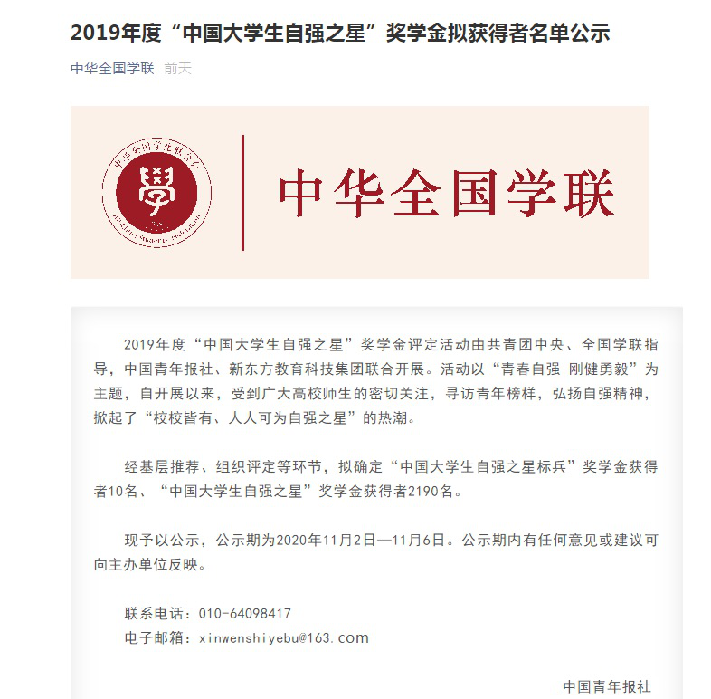 近日,由共青团中央、全国学联、中国青年报社、新东方教育科技集团联合开展的2019年度“中国大学生自强之星”奖学金推报活动获奖结果揭晓。经学校推荐、省级初评、全国评审等环节,共评选出我市42位大学生荣获2019年度“中国大学生自强之星”称号,其中,pp电子机械工程学院17包装一班阮世会同学荣获2019年度“中国大学生自强之星”荣誉称号和奖学金。