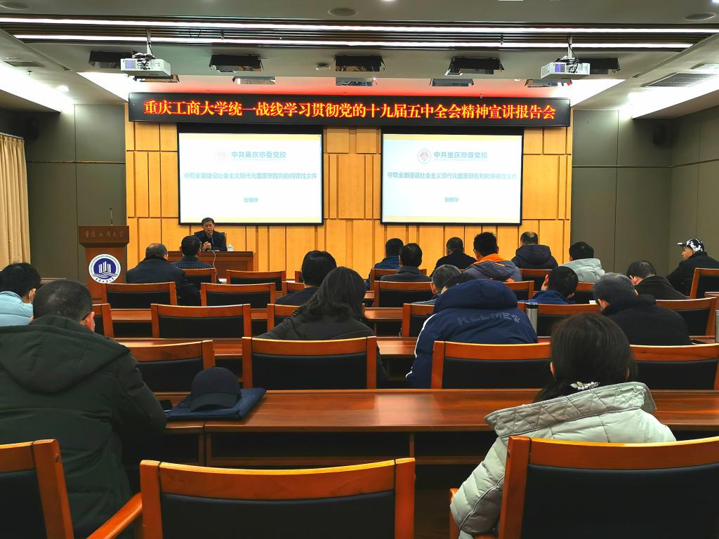 按照《pp电子游戏平台网站学习宣传贯彻党的十九届五中全会精神工作方案》(重工商大委【2020】97号)相关要求,12月17日下午,学校在新图书馆会议中心一会议室举办统一战线学习贯彻党的十九届五中全会精神宣讲报告会,邀请中共重庆市委党校(重庆行政学院)张新华教授作宣讲报告。学校党委统战部常务副部长陈松主持宣讲报告会。学校非中共党员的市、区人大代表、政协委员,民主党派市委委员、区委主委(副主委),各民主党派基层组织和统战团体的领导班子、成员代表以及党委统战部干部,共计60余人参加了报告会。