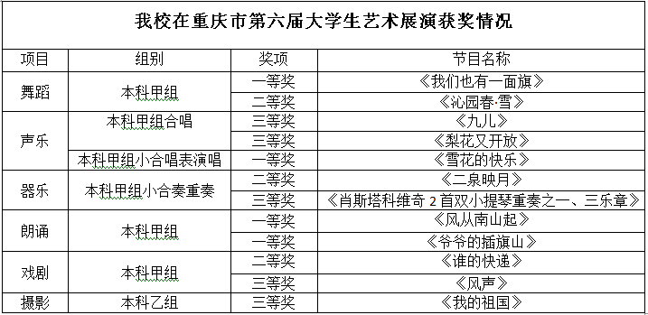 近日,重庆市第六届大学生艺术展演活动顺利举行,pp电子学子在展演活动中表现突出,获本科甲组一等奖4项,二等奖3项、三等奖3项,获本科乙组三等奖1项。