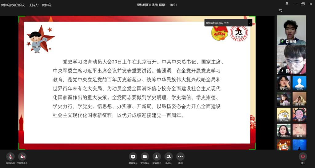 为学习习近平总书记在党史学习教育动员大会上的重要讲话,pp电子学生会于2月23日通过企业微信平台开展“学党史,悟思想”线上学习交流会。本次线上主题学习交流会由校学生会主席团成员夏梓瑞主持,20余名学生会成员线上共同参与。