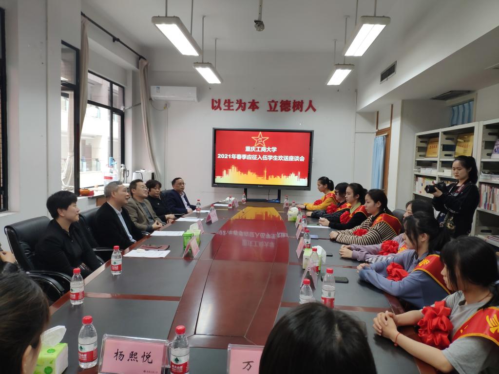 3月18日中午,pp电子在党委武装部会议室为即将入伍的7名女生举行欢送座谈会。副校长李国军,校党委武装部负责人、入伍学生家长和退伍学生代表参加座谈会。会议由退伍学生万焮主持。
