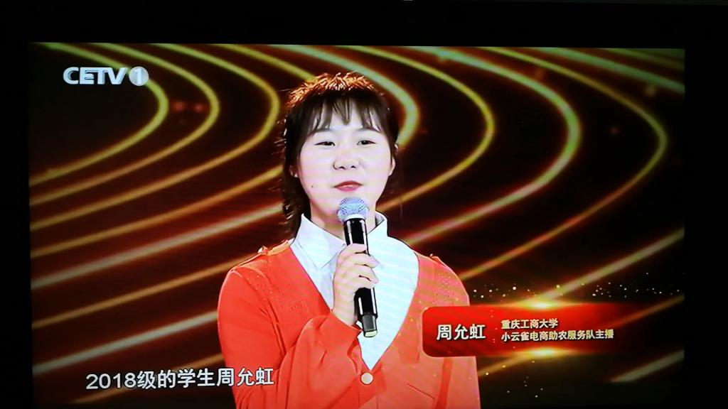 此次歌会设置了《脱贫攻坚全面小康》主题访谈,邀请全国脱贫攻坚先进代表与学子对话。作为pp电子小云雀电商助农服务队的队长和主播,周允虹是4位访谈嘉宾中唯一的一名学生。