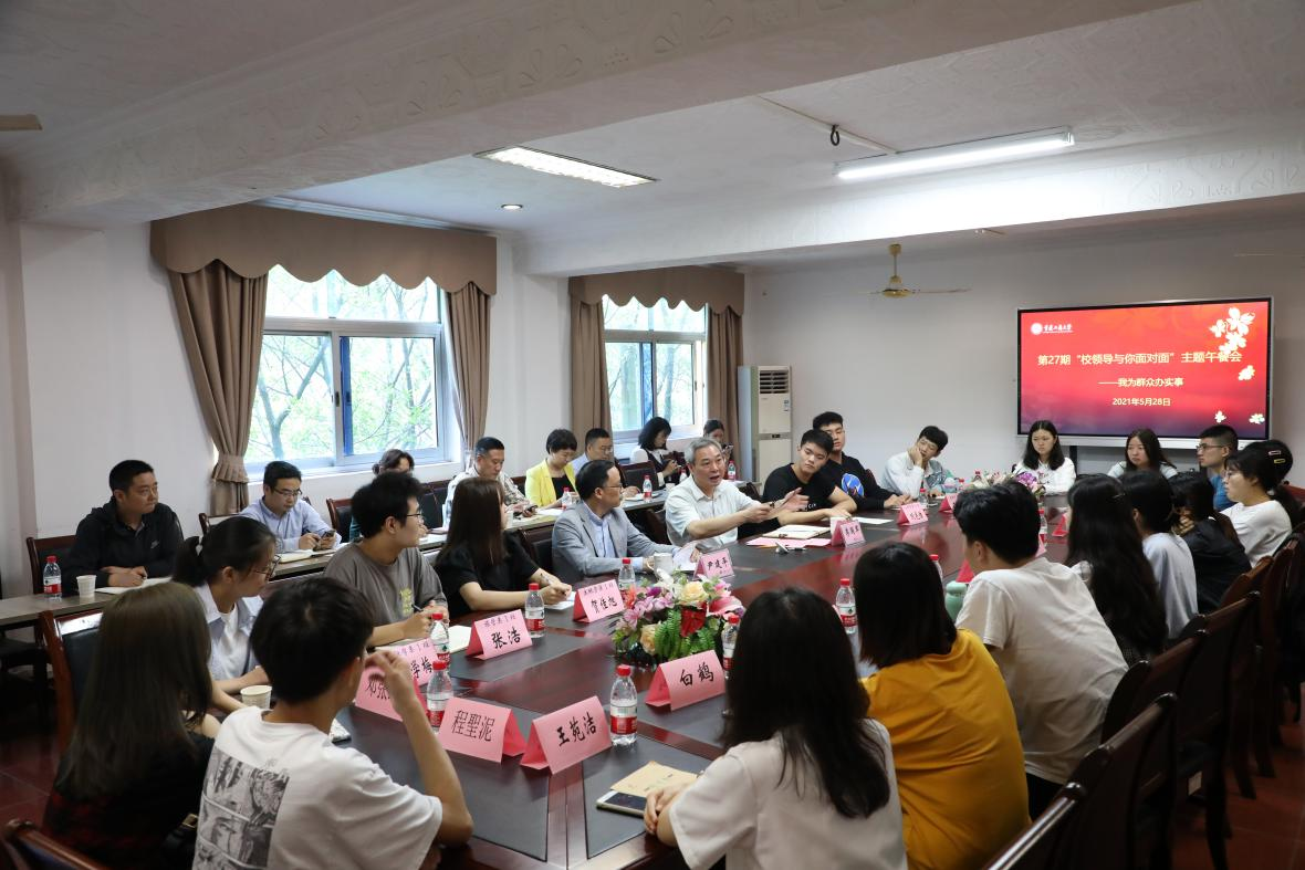 为进一步推进党史学习教育工作,以实际行动迎接中国共产党成立100周年,切实解决同学们在学习生活中面临的最关心、最直接、最现实的问题,5月28日上午,pp电子在江北校区修德楼三楼会议室召开了第27期“校领导与你面对面”主题午餐会,副校长李国军出席会议,相关职能部门负责人、学生代表参加了本次会议。