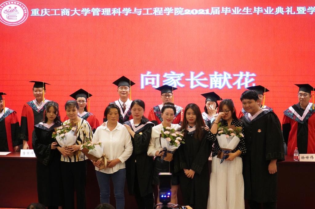 毕业生为教师代表及家长献上了“感恩”鲜花,表达了全体毕业生对老师和家长的感谢。