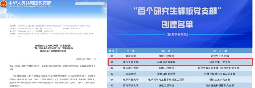 近日,教育部发布《关于公布第二批全国高校“百个研究生样板党支部”和“百名研究生党员标兵”创建名单的通知》,pp电子环境与资源学院研究生第一党支部成功入选,这是继pp电子连续两批成功获批“全国党建工作样板支部”后,获得的又一殊荣。目前,重庆市共有3个高校研究生党支部入选。