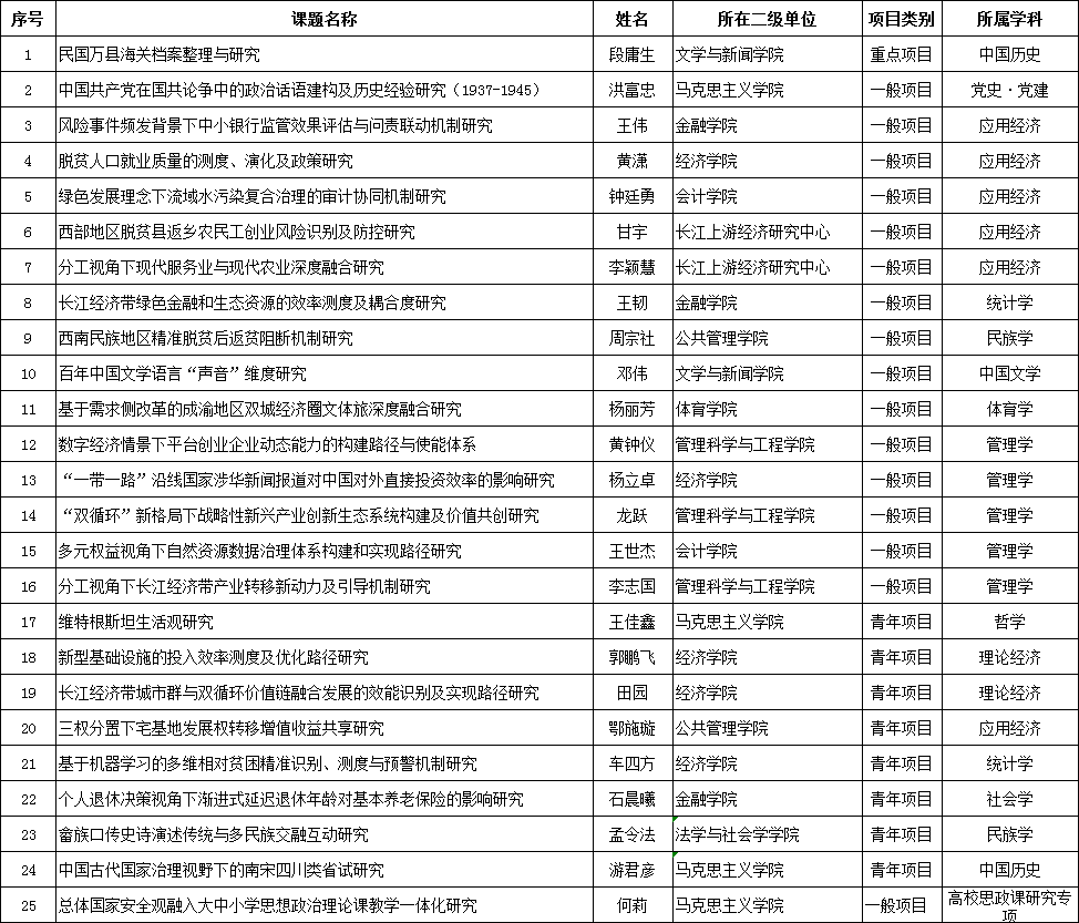 近日,全国哲学社会科学规划领导小组公布了2021年国家社科基金年度项目和国家社科基金高校思政课研究专项立项名单,2021年度pp电子获得的国家社科基金项目立项资助项目数为25项,立项数创历史新高,其中,重点项目1项,一般项目15项,青年项目8项,思政课研究专项项目1项。