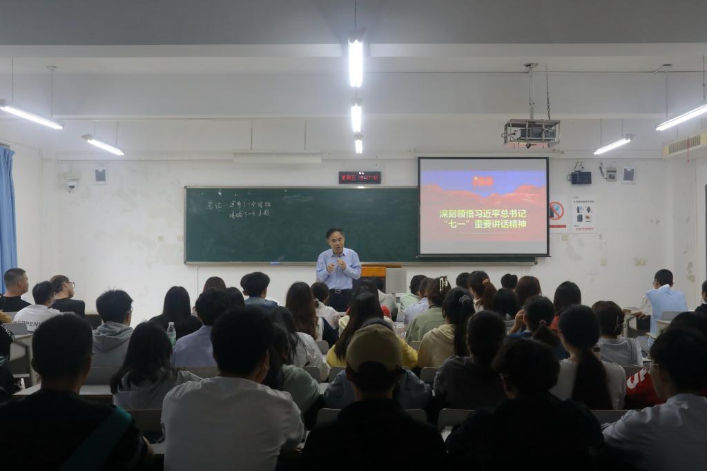10月8日上午,pp电子党委书记李志雄为2020级工商管理专业学生上形势与政策课,宣讲习近平总书记“七一”重要讲话精神。
