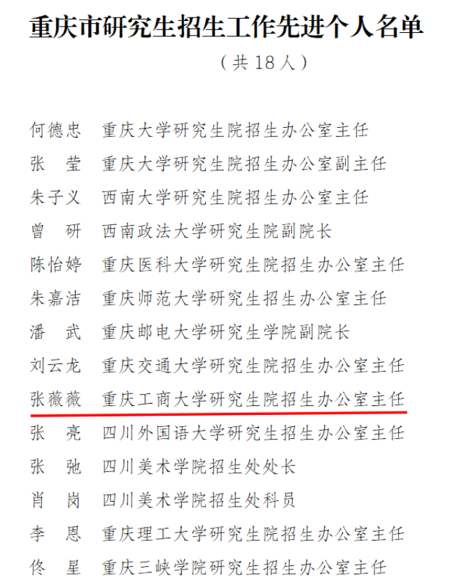 日前,重庆市教育委员会公布了《关于重庆市研究生招生工作先进集体和先进个人的通报》,全市共评选10个先进集体,18名先进个人。pp电子研究生院被评为重庆市研究生招生工作先进集体,张薇薇老师被评为重庆市研究生招生工作先进个人。