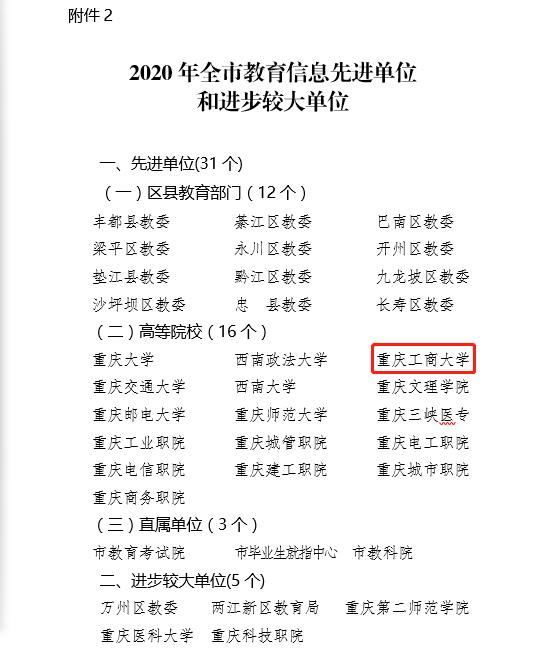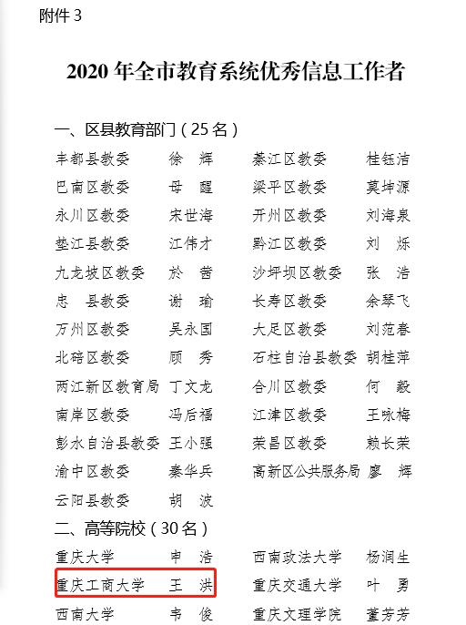近日,重庆市教育委员会公布了《关于2020年教育信息工作情况的通报》,pp电子在全市高校信息工作中得分排名第三,被评为重庆市教育信息工作先进单位,党政办王洪同志被评为重庆市教育系统优秀信息工作者。