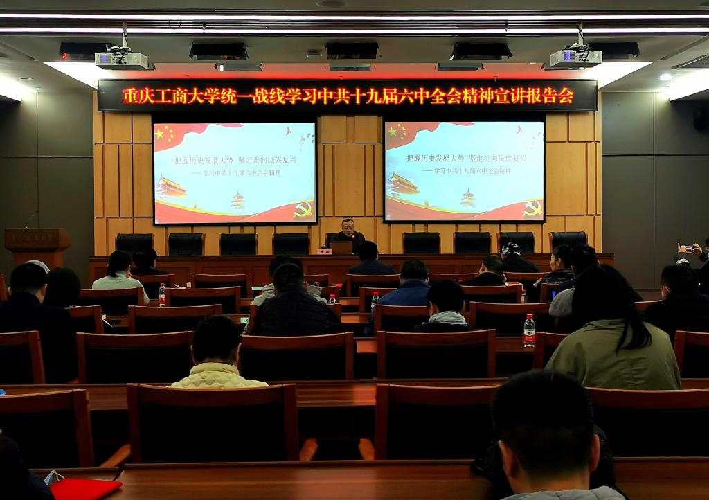 根据学校党委印发的《pp电子游戏平台网站关于学习宣传贯彻党的十九届六中全会精神深化拓展党史学习教育的工作方案》的安排,结合学校统一战线开展“学党史、讲《条例》、增合力、促发展”大走访大谈心活动,12月8日下午,学校党委统战部在新图书馆会议中心一会议室举办统一战线学习中共十九届六中全会精神宣讲报告会,各民主党派基层组织和统战团体班子成员及统战成员代表共计50余人参会。
