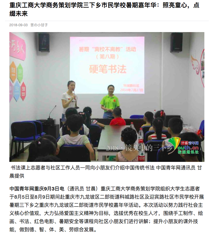 暑期期间,商务策划学院大学生志愿者团队响应全国大中专学生志愿者暑期文化科技卫生“三下乡”社会实践活动的号召,前往重庆市九龙坡区二郎街道科城路社区及迎宾路社区市民学校开展暑期嘉年华活动。本次活动以努力践行社会主义核心价值观,大力弘扬爱国主义精神为目标,助力文化,提高社区精神文明建设,促进社会主义和谐发展。志愿者们结合自身技能,以饱满的热情,严谨的态度围绕手工制作、绘画、书法、红岩电影、暑期安全等课程向社区小朋友们耐心讲解。授课过程中,气氛热烈,欢笑不断。小朋友们既收获了知识,又获得了友谊。在这期间,该志愿团队的突出表现也受到了社会各界媒体的广泛关注和报道。