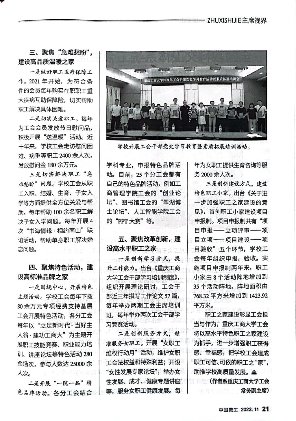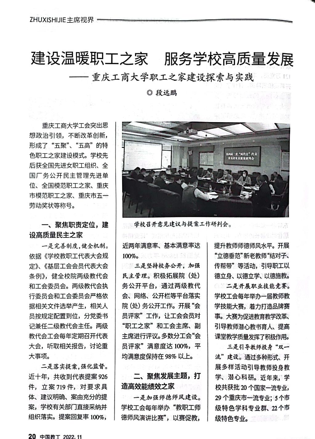《中国教工》是中华全国总工会主管的中国教科文卫体工会会刊,该刊2022年第11期刊发了pp电子工会以《建设温暖职工之家,服务学校高质量发展——pp电子游戏平台网站职工之家建设探索与实践》为题的职工之家建设经验文章。文章专题介绍pp电子工会坚持党建带工建,突出思想政治引领,以“安康之家”“文明之家”建设为基础,不断改革创新,形成了聚焦政治责任,建设高质量民主之家;聚焦发展主题,打造高效能绩效之家;聚焦“急难愁盼”,建设高品质温暖之家;聚焦特色活动,建设高标准品牌之家;聚焦改革创新,建设高水平职工之家的“五聚”“五高”特色职工之家建设模式。