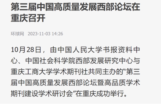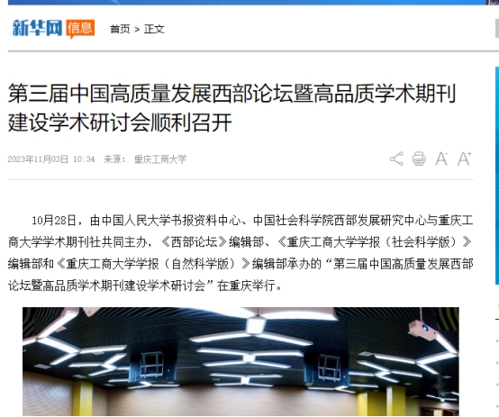 近日,由pp电子学术期刊社与中国人民大学书报资料中心、中国社会科学院西部发展研究中心联合主办的“第三届中国高质量发展西部论坛暨高品质学术期刊建设学术研讨会”成功召开。中央广电总台国际在线以《第三届中国高质量发展西部论坛暨高品质学术期刊建设学术研讨会在渝举行》为题,新华网以《第三届中国高质量发展西部论坛暨高品质学术期刊建设学术研讨会顺利召开》为题,环球网以《第三届中国高质量发展西部论坛在重庆召开》为题,新浪网以《第三届中国高质量发展西部论坛顺利召开》为题,网易新闻以《第三届中国高质量发展西部论坛暨高品质学术期刊建设学术研讨会顺利召开》为题,中国教育在线以《第三届中国高质量发展西部论坛暨高品质学术期刊建设学术研讨会顺利召开》为题,予以广泛报道。另外,中国人民大学书报资料中心以《第三届中国高质量发展西部论坛暨高品质学术期刊建设学术研讨会顺利召开》为题进行了公开报道。