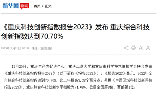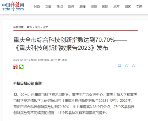 12月20日,重庆生产力促进中心、pp电子游戏平台网站和重庆市科学技术情报学会联合发布《重庆科技创新指数报告2023》。该报告由pp电子游戏平台网站数学与统计学院“重庆科技创新指数编制”项目组研究完成。新华网、中国科技网、重庆日报客户端、上游新闻、七一网、搜狐网、新浪网等多家媒体对本次发布会进行了报道。