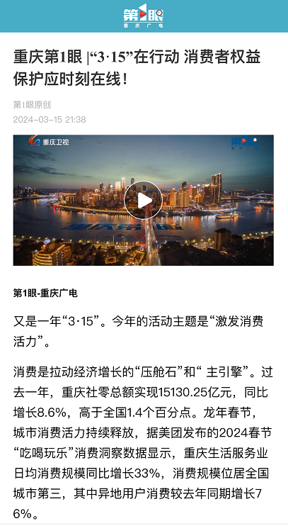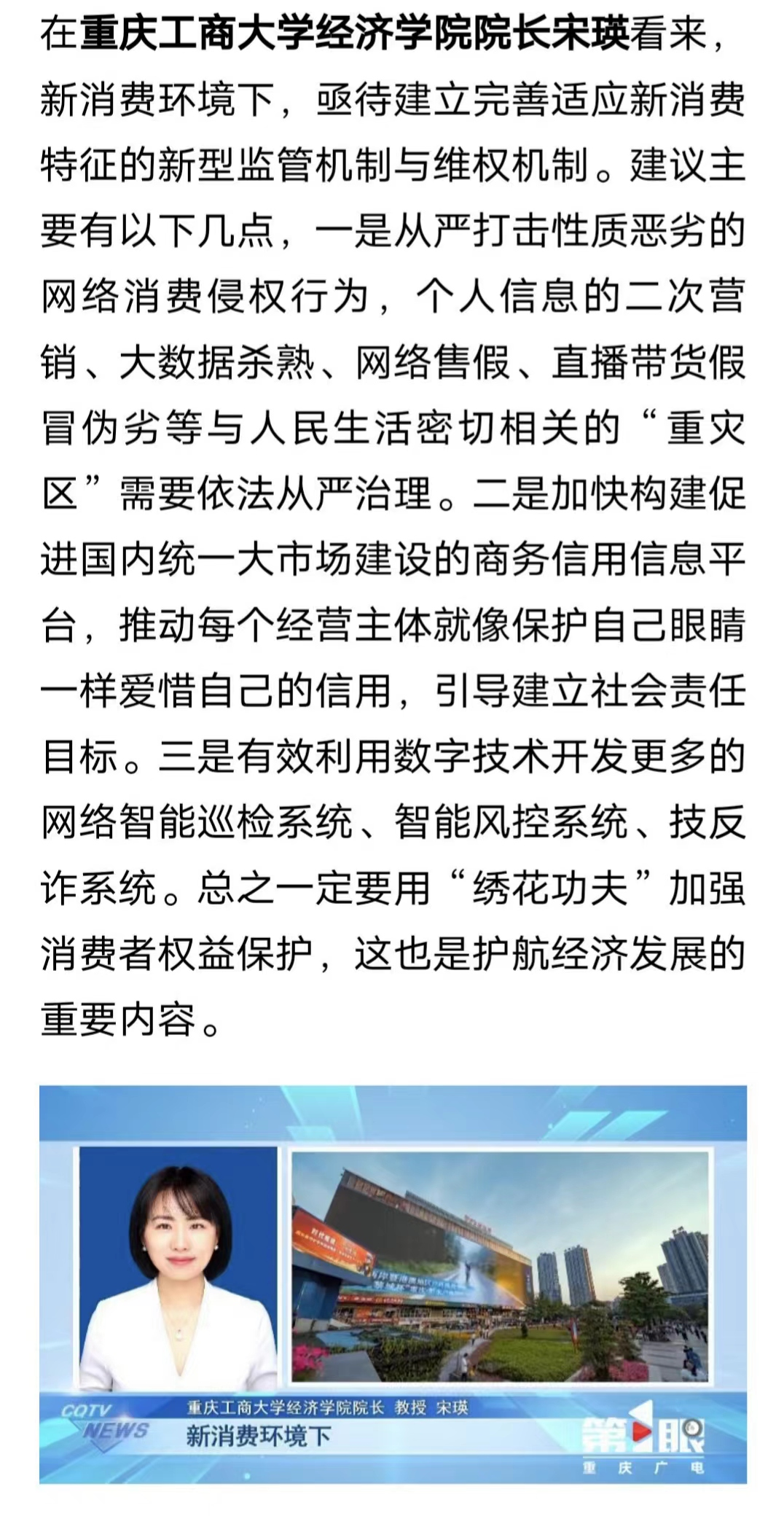 3月15日,重庆卫视《第1眼新闻》报道pp电子经济学院院长宋瑛教授谈论新消费环境下消费者权益保护问题。她就“高质量的产品服务是高质量发展的重要一步,怎样让315变365,激发消费活力?”针对高质量的产品服务和高质量发展的内在逻辑进行深入分析并提供建议。
