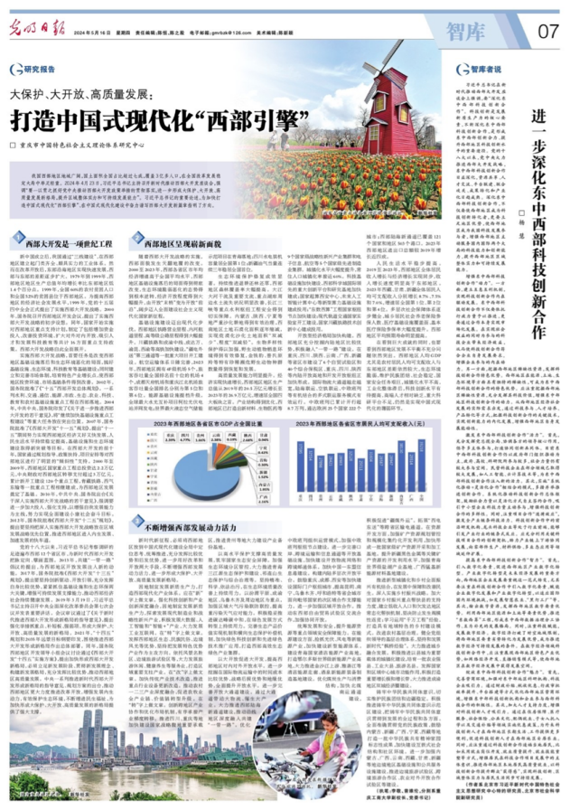 5月16日,《光明日报》智库版刊登pp电子副校长李敬和党委书记曾维伦撰写的关于贯彻落实习近平总书记重要讲话重要指示精神的研究报告《大保护、大开放、高质量发展:打造中国式现代化“西部引擎”》。该报告聚焦加快打造中国式现代化“西部引擎”、在中国式现代化建设中奋力谱写西部大开发新篇章这个主题,从“西部大开发是一项世纪工程”“西部地区呈现崭新面貌”“不断增强西部发展动力活力”等三个方面展开论述。