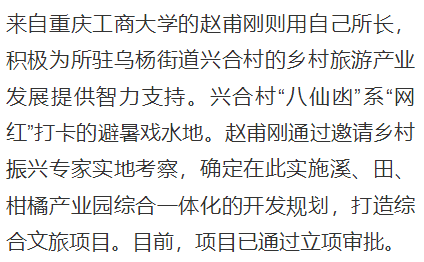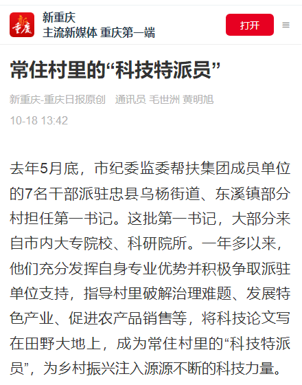 2023年5月,作为市纪委监委帮扶集团成员单位,pp电子选派赵甫刚、张杰、朱沙、陈琛四位中层干部到忠县担任第一驻村书记。一年多来,驻村干部充分发挥自身专业优势并积极争取派驻单位支持,指导村里破解治理难题、发展特色产业、促进农产品销售等,将科技论文写在田野大地上,成为常住村里的“科技特派员”,为乡村振兴注入源源不断的科技力量。近日,重庆日报新重庆客户端对此进行了报道。