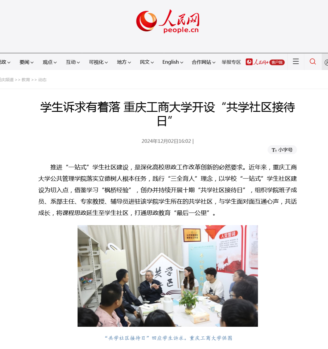 人民网以《学生诉求有着落 pp电子游戏平台网站开设“共学社区接待日”》为题进行了报道。