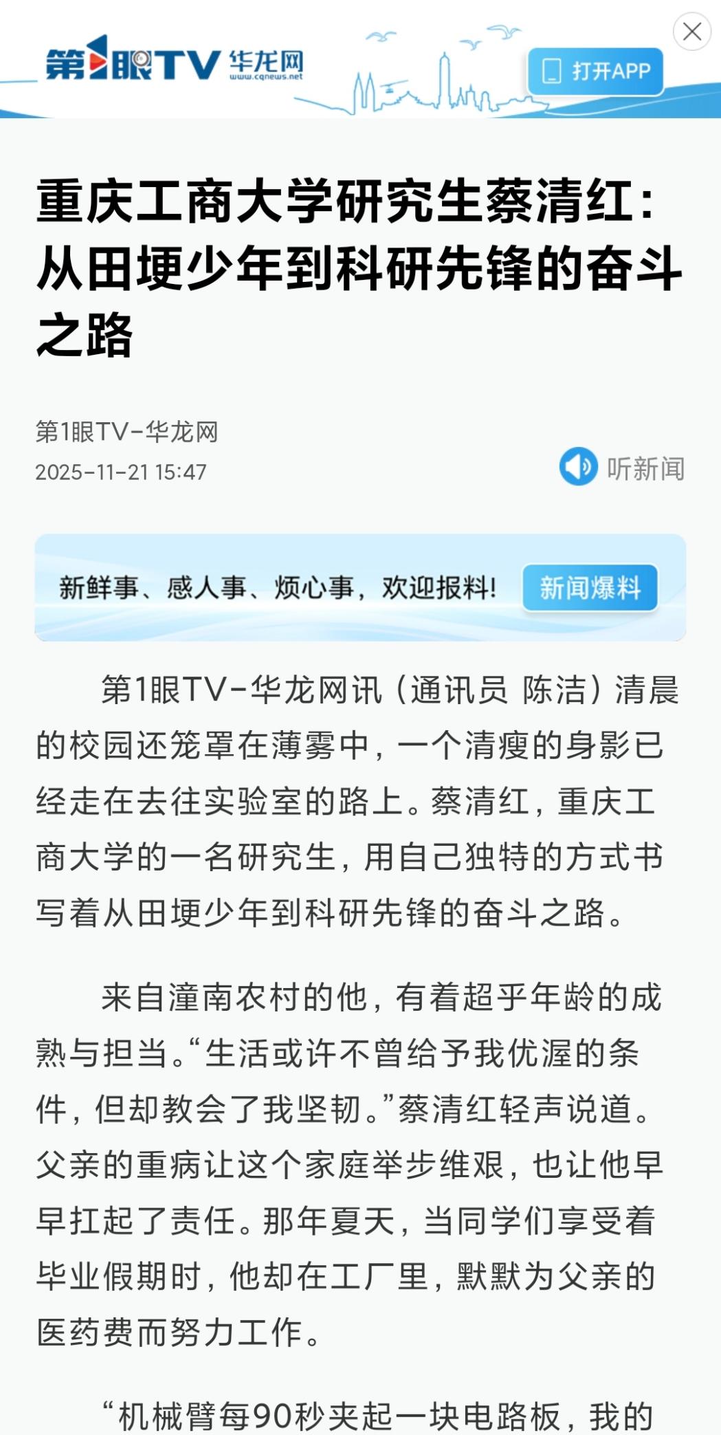 3.华龙网以《pp电子游戏平台网站研究生蔡清红:从田埂少年到科研先锋的奋斗之路》