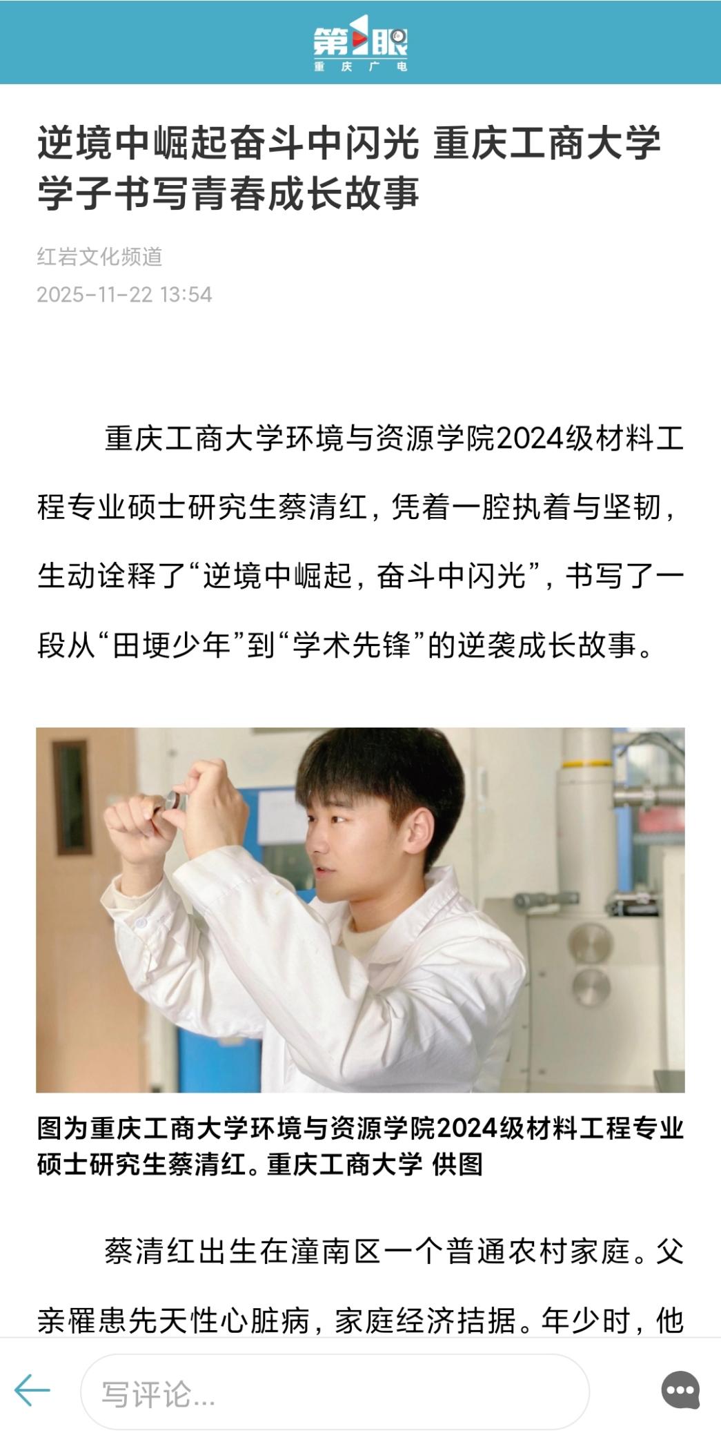 近日,pp电子环境与资源学院2024级材料工程专业硕士研究生蔡清红的成长故事引发关注。这位从潼南农村走出的“田埂少年”,凭借执着与坚韧突破逆境,在学术科研与社会服务中绽放青春光彩,成为新时代青年奋斗的鲜活典范。