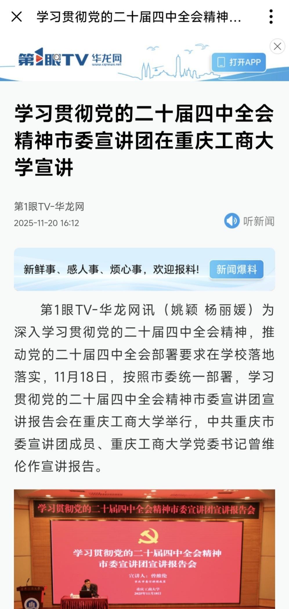 重庆日报以《市委宣讲团成员赴各区县各部门各单位宣讲党的二十届四中全会精神 切实把思想和行动统一到全会精神上来》为题,重庆新闻联播以《学习贯彻党的二十届四中全会精神·市委宣讲团成员赴各区县各部门各单位宣讲党的二十届四中全会精神》为题,华龙网以《学习贯彻党的二十届四中全会精神市委宣讲团在pp电子游戏平台网站宣讲》为题作报道。