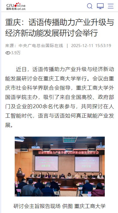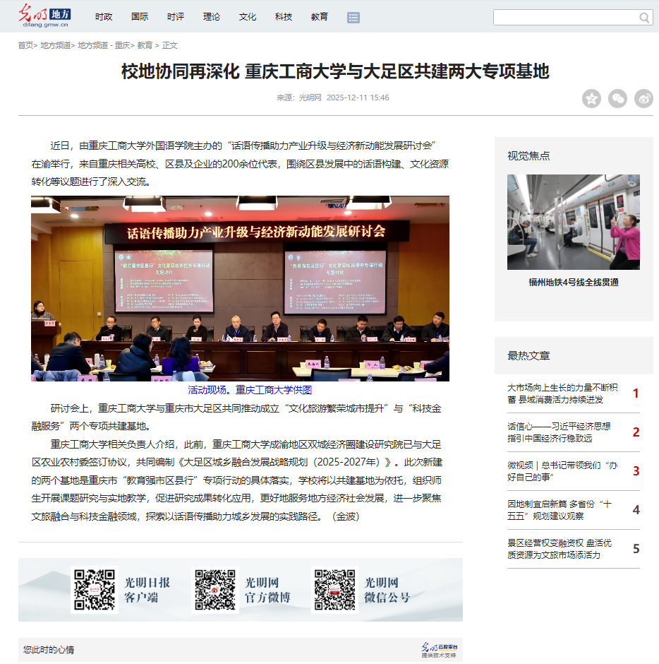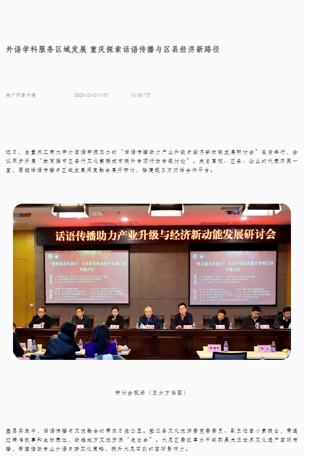 光明网以“校地协同再深化 pp电子游戏平台网站与大足区共建两大专项基地”为题,央广网以“外语学科服务区域发展 重庆探索话语传播与区县经济新路径”为题,中央广电总台国际在线以“重庆:话语传播助力产业升级与经济新动能发展研讨会举行”为题,中国新闻网以“话语传播如何驱动产业新动能?重庆这场研讨会给出了答案”为题纷纷关注报道。截至目前,相关报道的阅读量已超过91.1万人次。