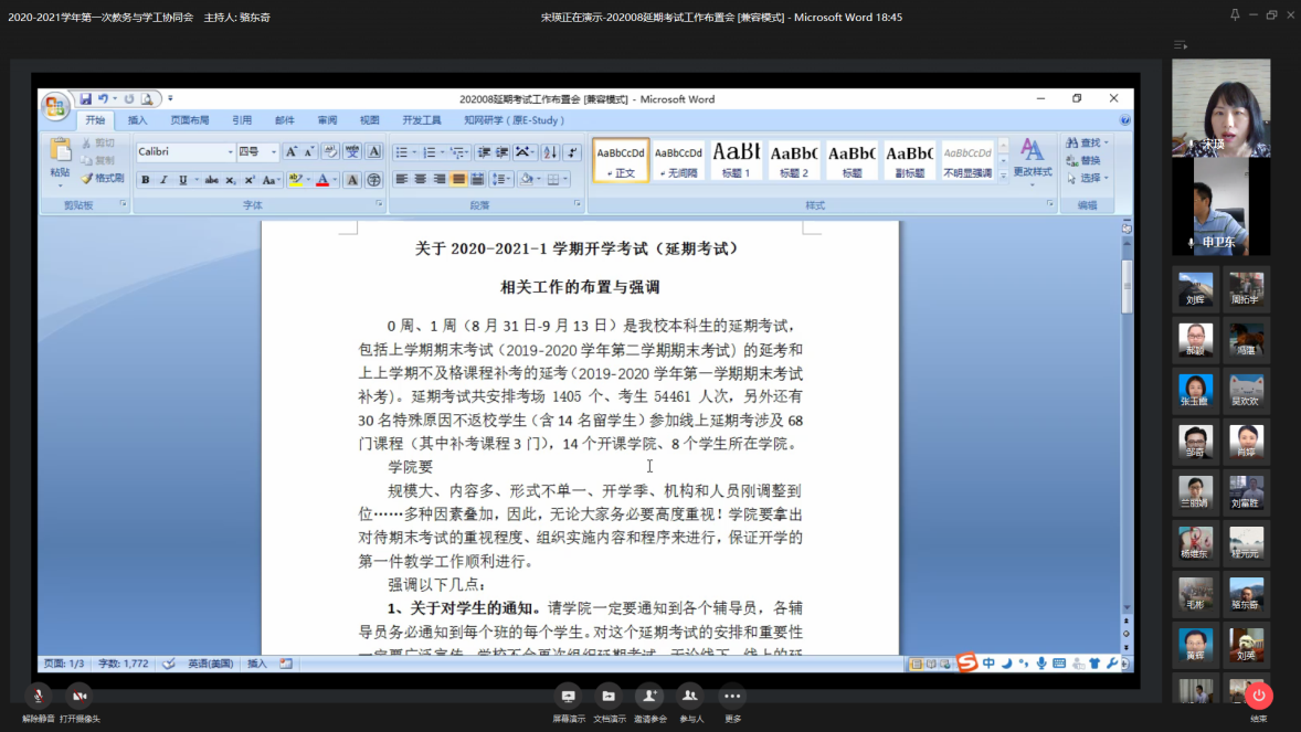 教务处副处长宋瑛从学生考试安排、监考教师、教室安排、考试试卷、巡考、成绩评定、不返校学生的延期考试等全方面对开学考试(延期考试)工作做了布置。教务处副处长胡卫军就本次开学考试的成绩登录提了具体要求。