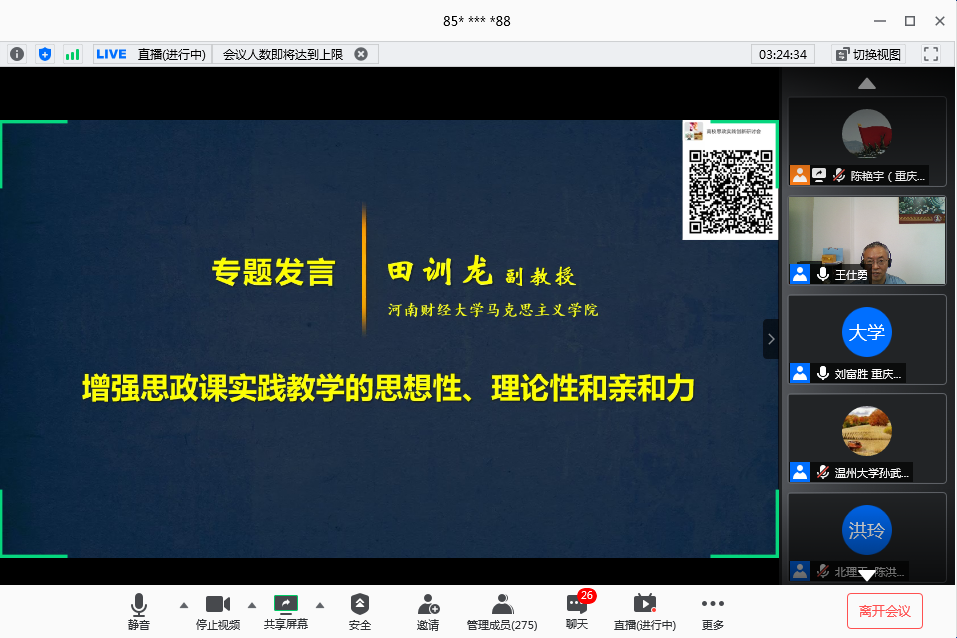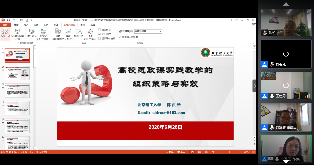 pp电子刘富胜教授分享了“高校思想政治理论课‘全覆盖两结合三支撑’综合实践改革”为题,介绍了“六大模块”和“十大环节”的教学设计,以及疫情期间pp电子通过“思想政治理论课综合实践”课程对学生进行安全教育、思想引领和心理疏导,激发了教师参与教学的积极性和主动性,增强了学生的认同感和获得感。