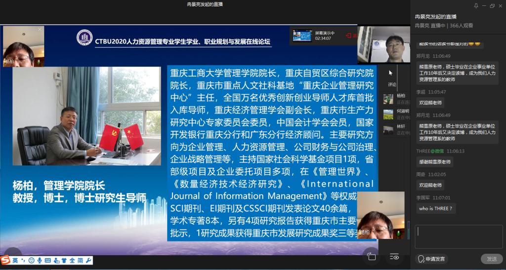 2020年3月14日上午,在我国新冠肺炎疫情防控趋势积极向好背景下,CTBU2020年人力资源管理专业学生学业、职业规划与发展在线论坛通过学校“企业微信”平台直播顺利召开。副校长李国军,管理学院党委书记王建明、院长杨柏、党委副书记王静、副院长周莉、副院长黄钟仪、人力资源管理系系主任郑月龙参加了此次在线论坛。重庆云日产业集团董事长黄子华为特邀嘉宾并作主题发言。校友嘉宾广州名度网络科技有限公司创始人、总经理张喜春,重庆房地产职业学院彭茜老师,重庆中雷律师事务所副主任王明涛律师及重庆中科建设(集团)有限公司人力资源部曹洋铭总监等参加了活动并发言分享。人力资源管理系全体老师、校友、同学、家长共计450余人次参与了论坛。论坛由人力资源管理系冉景亮博士主持。