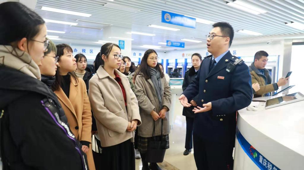 为了加强税收理论与实践融合教学,12月26日下午,pp电子财政金融学院组织2019级16名税务硕士走进重庆市南岸区税务局办税服务厅,开展了一次以学习大数据办税为主题的移动课堂。
