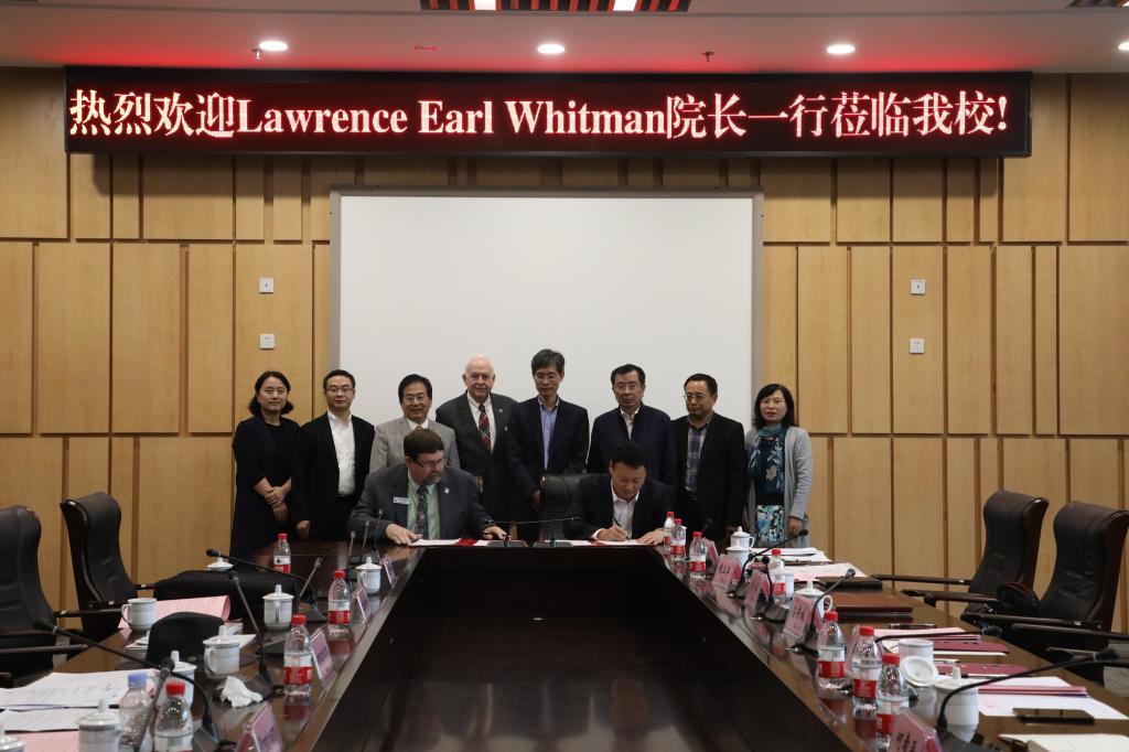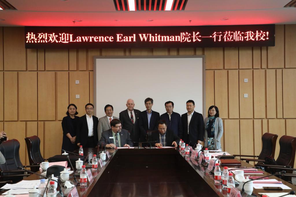 何希平、刘洋与UALR-EIT院长Pro.Lawrence Earl Whitman签订了合作备忘录并合影留念。