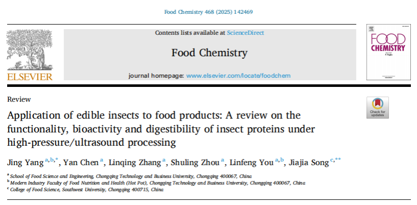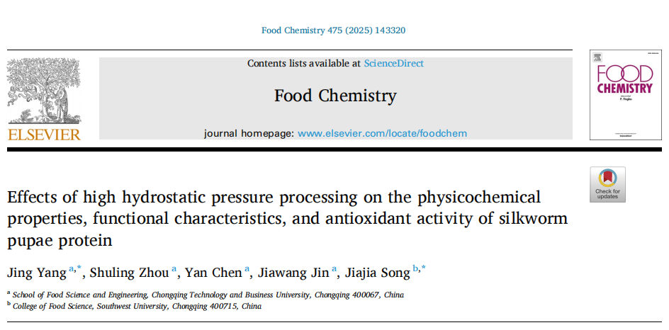杨景副教授在《Food Chemistry》期刊上发表了三篇研究论文分别是“Changes of digestive stability and potential allergenicity of high hydrostatic pressure-treated ovalbumin during in vitro digestion”“Effects of high hydrostatic pressure processing on the physicochemical properties, functional characteristicsand antioxidant activity of silkworm pupae protein”和“Application of edible insects to food products: A review on the functionality, bioactivity and digestibility of insect proteins under high-pressure/ultrasound processing”。