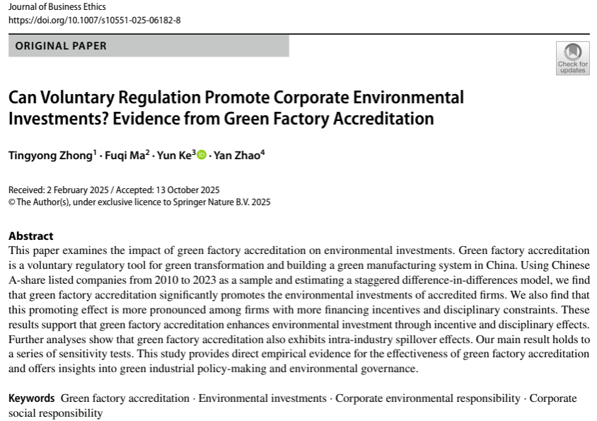 近日,pp电子会计学院在服务国家“双碳”战略相关研究领域取得新进展。会计学院钟廷勇教授作为第一作者、以pp电子游戏平台网站为第一署名单位的研究团队,其学术论文《自愿性规制能否促进企业环保投资:来自“绿色工厂”认证的证据》(Can Voluntary Regulation Promote Corporate Environmental Investments? Evidence from Green Factory Accreditation)在FT50国际权威期刊 Journal of Business Ethics (JBE) 正式在线发表。该研究聚焦于“双碳”目标背景下,如何有效引导企业进行绿色转型这一重要议题。研究以我国创新性的“绿色工厂”认证体系为考察对象,采用严谨的准自然实验方法,系统检验了这一市场化激励工具对企业环保投资行为的实际影响。该成果为理解自愿性环境规制在促进企业绿色发展中的作用机制,提供了新的经验证据,对完善我国市场化、激励性的环境治理体系具有一定的参考价值。