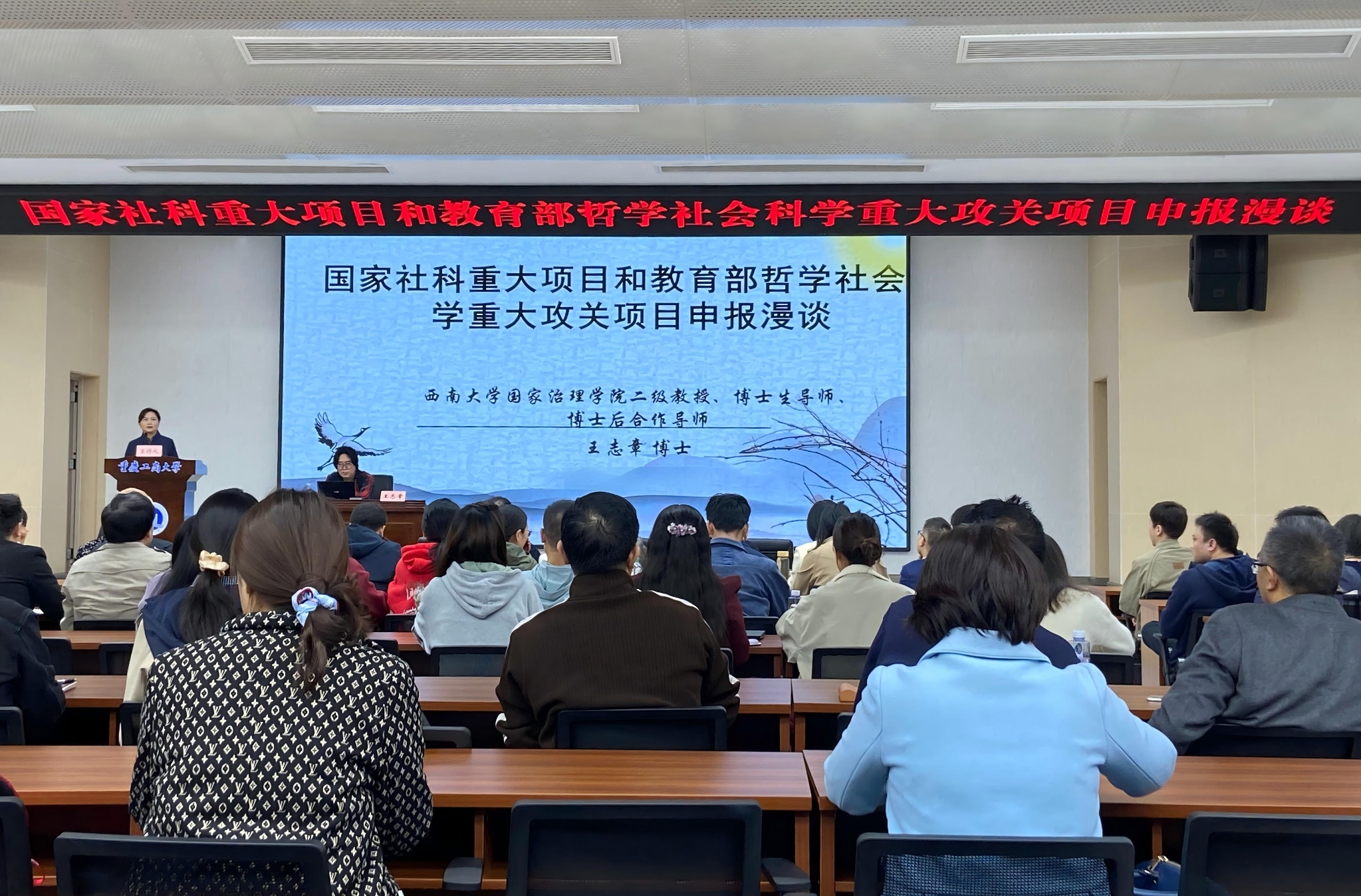 10月31日上午,学校在明德楼1019报告厅举办国家社科基金重大项目和教育部哲学社会科学研究重大课题攻关项目申报讲座。本次讲座邀请西南大学王志章教授主讲。党委常委、副校长任毅主持讲座。本次讲座是科研处今年下半年主办的第二场高层次科研项目申报讲座。