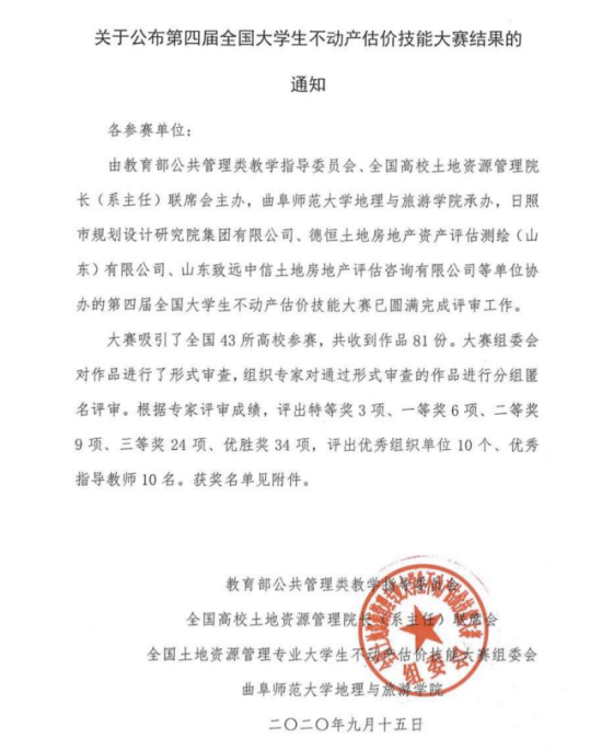 9月16日,第四届全国大学生不动产估价技能大赛圆满落下帷幕。pp电子管理科学与工程学院派出1支队伍、共4位队员参加此次大赛,经过激烈角逐,最终获得了优胜奖。