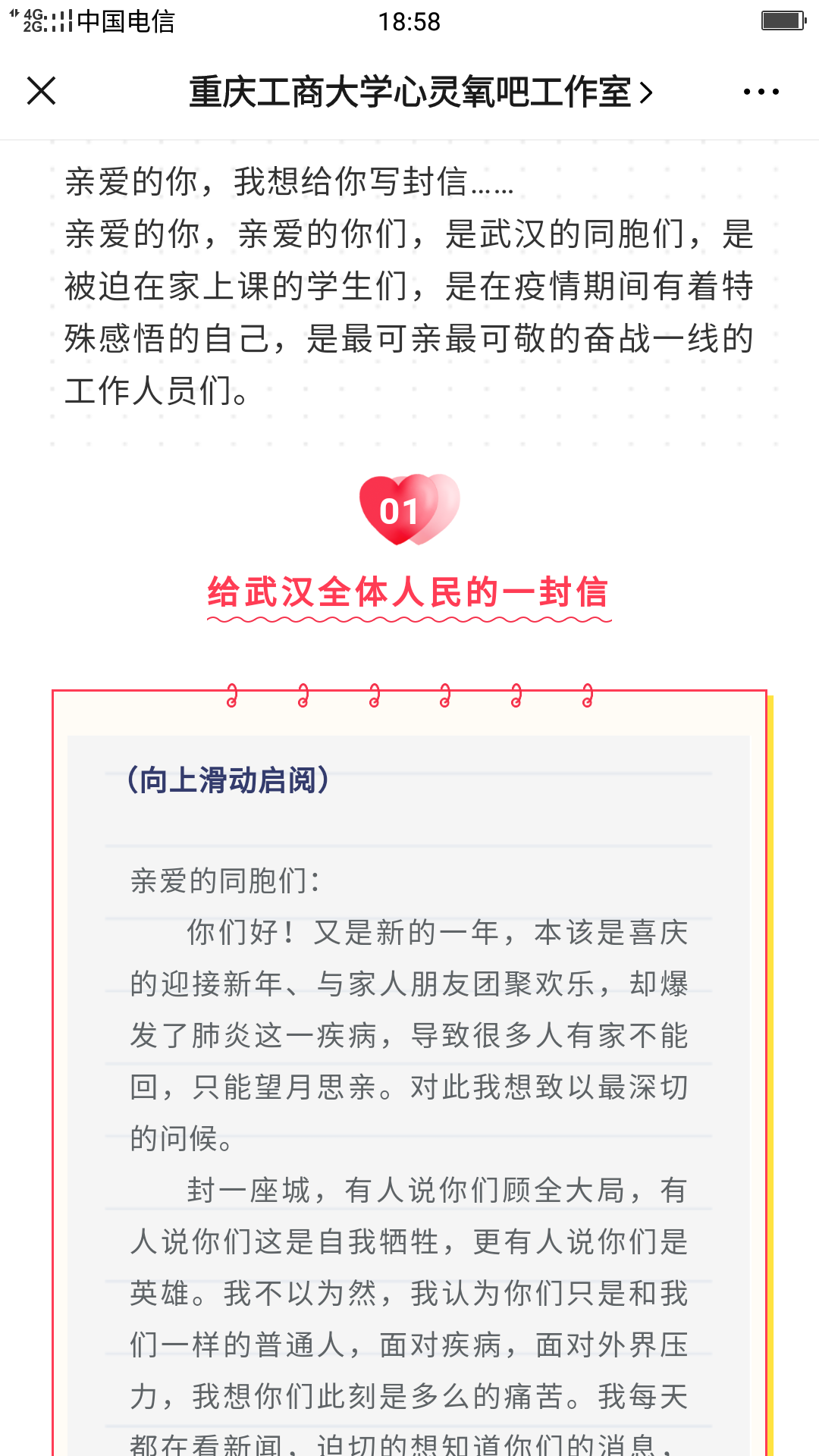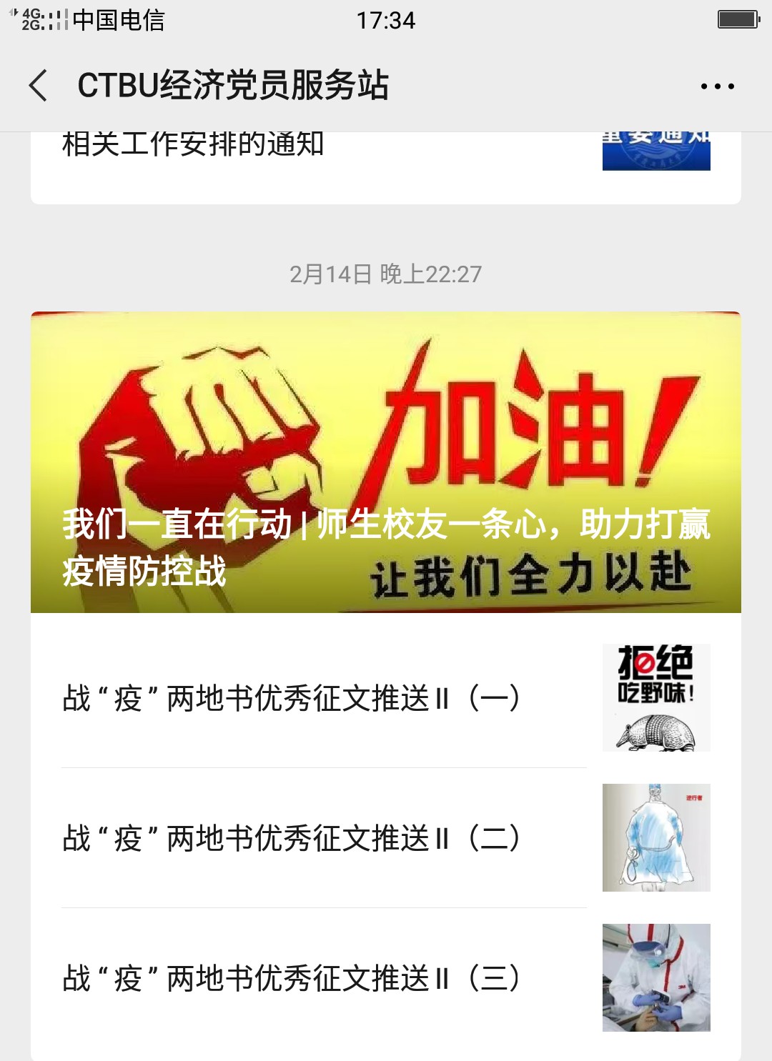 自新冠疫情发生以来,学校学工部、校团委、经济学院联合主办“战‘疫’两地书”活动,以“给......的一封信”的书信形式,征集原创、尚未公开发表征文,给奋斗在一线的广大医护人员、基层干部或湖北、武汉的同学们送去温暖与正能量。《给“白衣战士”的一封信》《给钟南山院士的一封信》《给武汉同胞们的一封信》《给新冠病毒的一封信》......这一封封的信件寄托着pp电子学生的敬佩、关心、希冀、牵挂,让艰难的日子充满温情,让战“疫”充满必胜的信心。