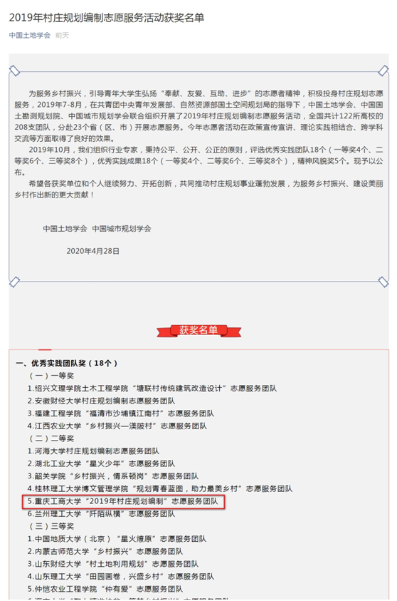 近日,中国土地学会公布了“2019年村庄规划志愿服务全国大学生暑期社会实践专项行动”的获奖名单,pp电子旅游与国土资源学院“2019年村庄规划编制”志愿服务团队荣获优秀实践团队二等奖。这是继2018年荣获全国优秀实践成果一等奖以来,旅游与国土资源学院实践团队第二次获得同类奖项,团队获奖作品由人文地理与城乡规划系专业教师郑凌予、蒲海霞,土地资源管理系专业教师鄂诗璇和辅导员胡菡共同指导。