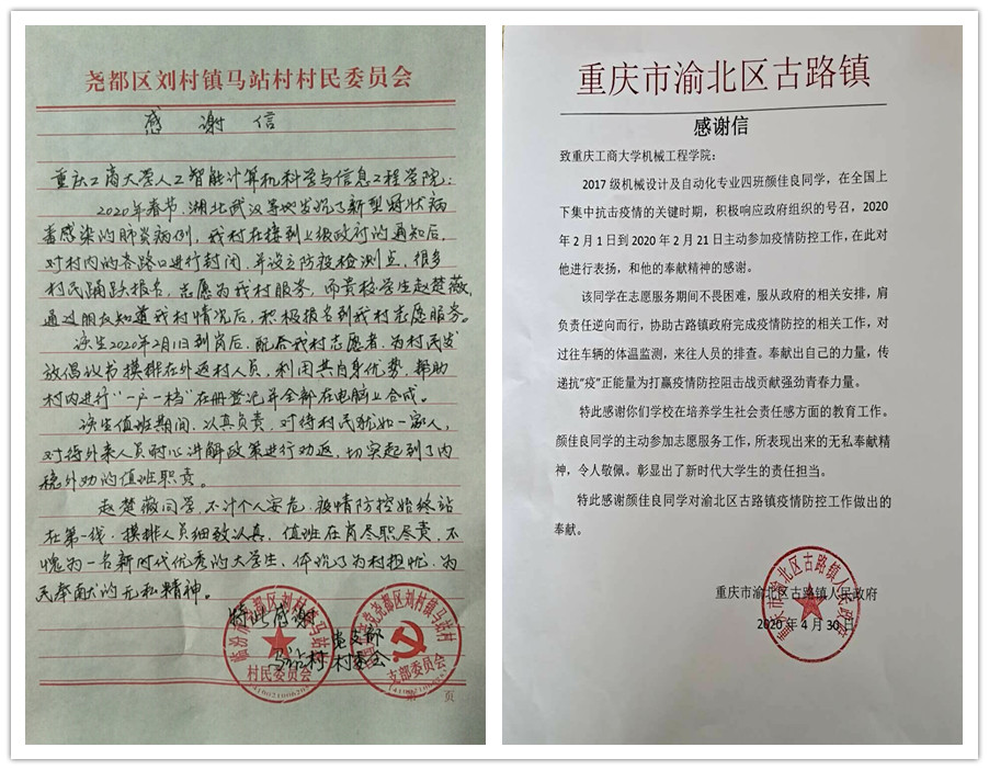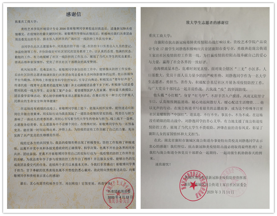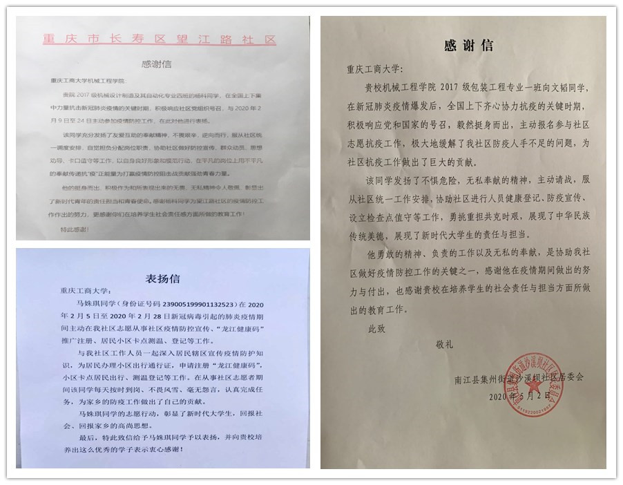 “青春由磨砺而出彩,人生因奋斗而升华”新冠肺炎疫情发生以来,重工商大志愿者们以青春的担当,迅速响应,积极投入,同在一线英勇奋战的广大疫情防控人员一道,不畏艰险、冲锋在前,为夺取疫情防控的胜利注入了鲜活的青春力量。3月以来,pp电子陆续收到河北曲周共青团、重庆永川五间镇共青团、重庆渝北区古路镇人民政府、山西临汾尧都区刘村镇马站村党支部等单位寄来的200余封感谢信,对pp电子青年在抗“疫”中的表现给予了高度的肯定和赞扬。