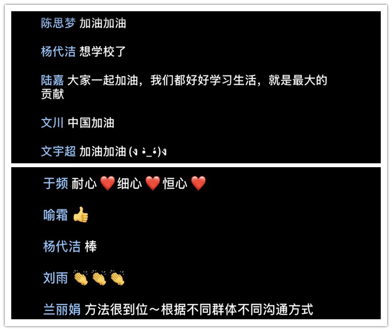 活动在视频《为爱逆行!坚守岗位抗击疫情的英雄们,也渴望回家》中开始,那些感动的瞬间温暖着屏幕前每一个人。家在重庆涪陵,来自管理学院的杨航分享到,在抗疫期间主要负责老旧小区的监管执勤,负责给隔离居民户送菜,父母的担忧、内心的恐惧也曾让他害怕,但是想到自己是一名党员,要勇担责任,他变得勇敢起来。来自艺术学院的崔敬博同学家住在河北,北方的冬天很冷,每天在外面执勤,他冻得脚尖都疼,仍坚持为社区居民测体温,还到当地县团委去参与疫情防控宣传,得到当地团委领导的好评。来自计信学院的万小波在四川宜宾家乡负责关卡的管控,当他看到无数党员干部冲锋在前,作为入党积极分子的他也毅然决定加入他们的队伍。来自机械工程学院的颜佳良同学,家住重庆渝北,从1月底开始就跟着父亲一起在高速路口工作,有时一天要工作十几个小时,他觉得再苦再累也值得。活动还邀请到了身在湖北孝感的经济学院袁家豪同学,他分享了在湖北家里面对疫情的体会和感受。直播间里的老师和同学,被大家的故事所打动,纷纷留言点赞,在线互动,一起为武汉加油,为中国加油。