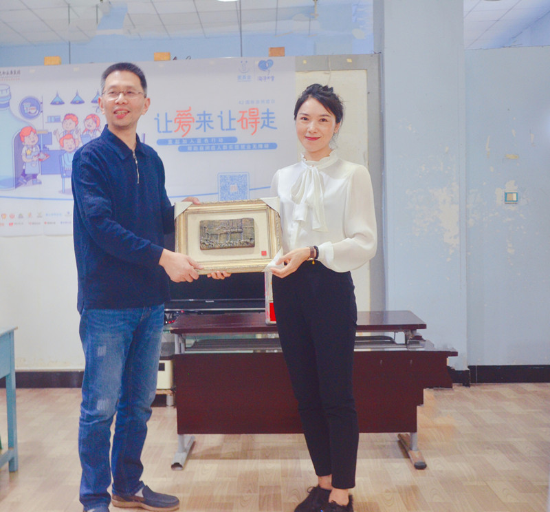 在美陶制作开始之前举行了简单的捐赠仪式,MBA学员班长刘太平代表全体学员向康复基地进行了捐赠,班长陈诗接受了康复基地回赠的纪念作品《轻轨穿楼》(第一件轻轨主题陶艺作品),基地黄建平主任出席捐赠仪式。