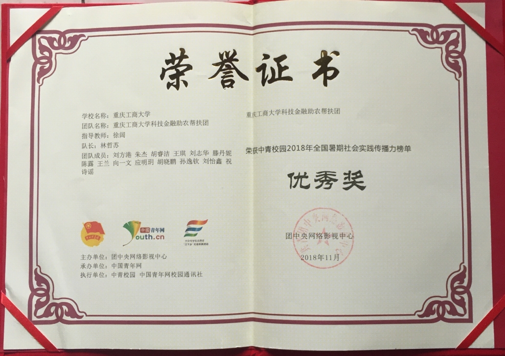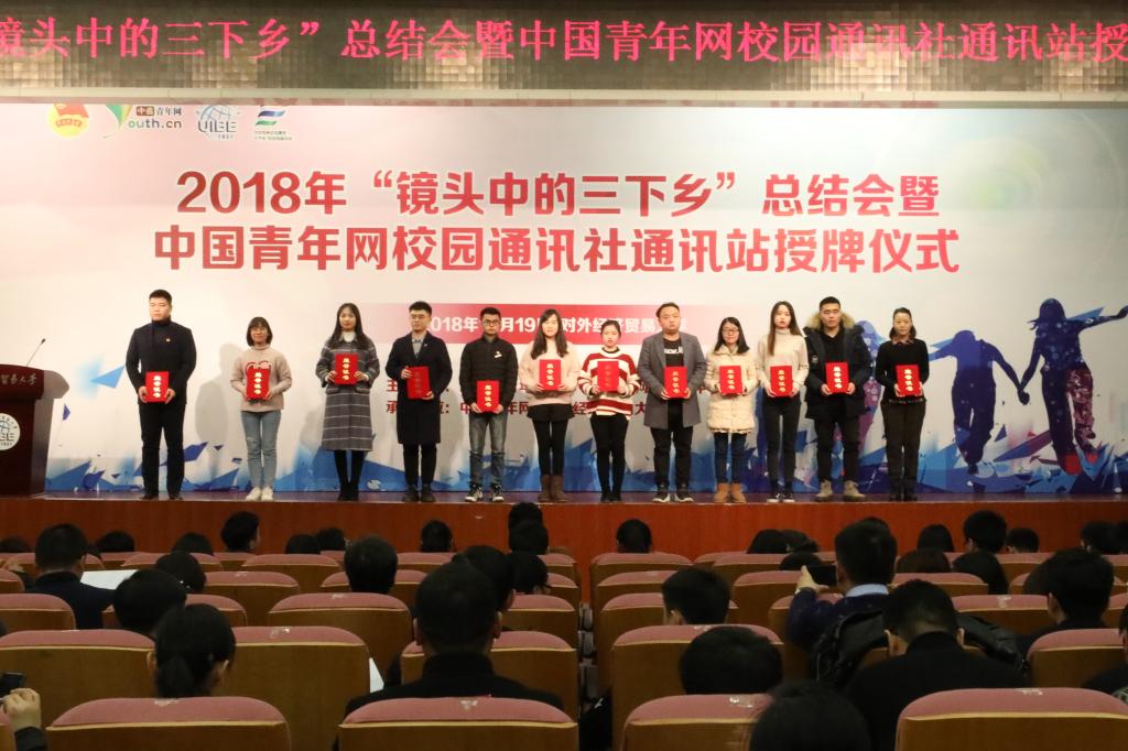 2018年12月19日,由团中央青年发展部、团中央网络影视中心主办,中国青年网、对外经济贸易大学团委承办的2018年“镜头中的三下乡”总结会暨中国青年网校园通讯社通讯站授牌仪式在对外经济贸易大学举行。财政金融学院三下乡团队队长林哲苏赴北京参与本次会议。此次会议包括清华大学、中央财经大学、华中师范大学、武汉科技大学等300余所高校参加。在本次由团中央举办的2018年“镜头中的三下乡”活动评选中,pp电子财政金融学院荣获全国百强传播力团队表彰。